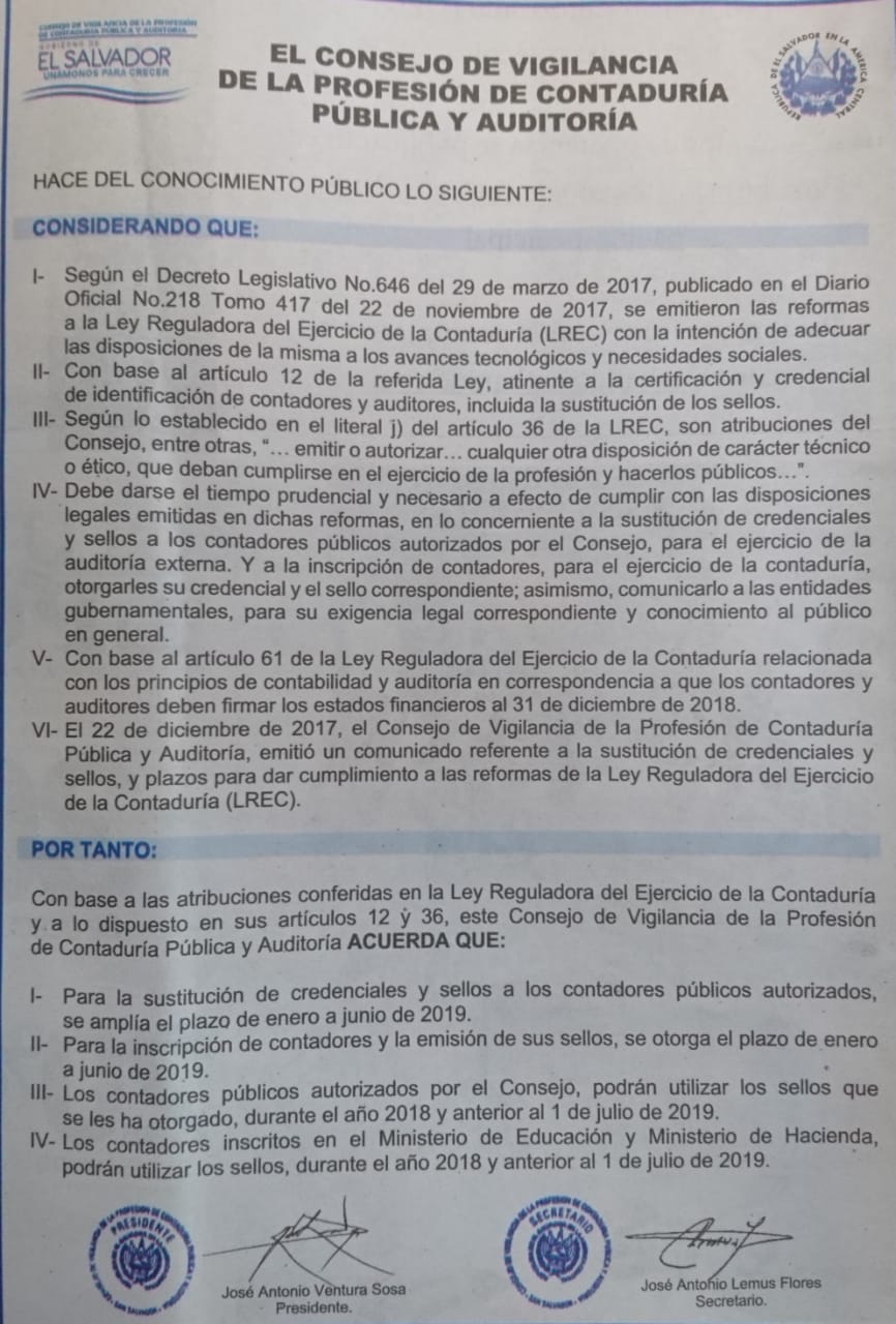 Se les recuerda que conforme la Resolución # 9 y Resolución #120, emitidas por el Consejo de Vigilancia de la Profesión de la Contaduría Pública y Auditoría el pasado marzo y 28 de Septiembre de 2018, respectivamente, en las que se establece que: